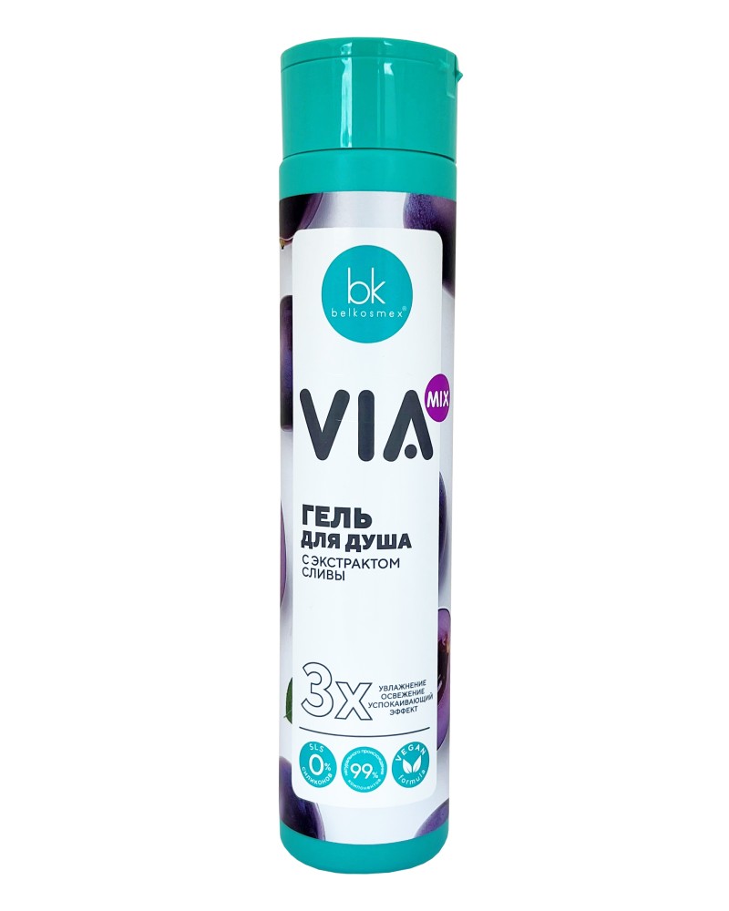 Гель для душа Via Mix с экстрактом сливы — поддерживает оптимальный уровень влаги, прекрасно насыщает кожу витаминами, обладает антиоксидантными и успокаивающими свойствами.