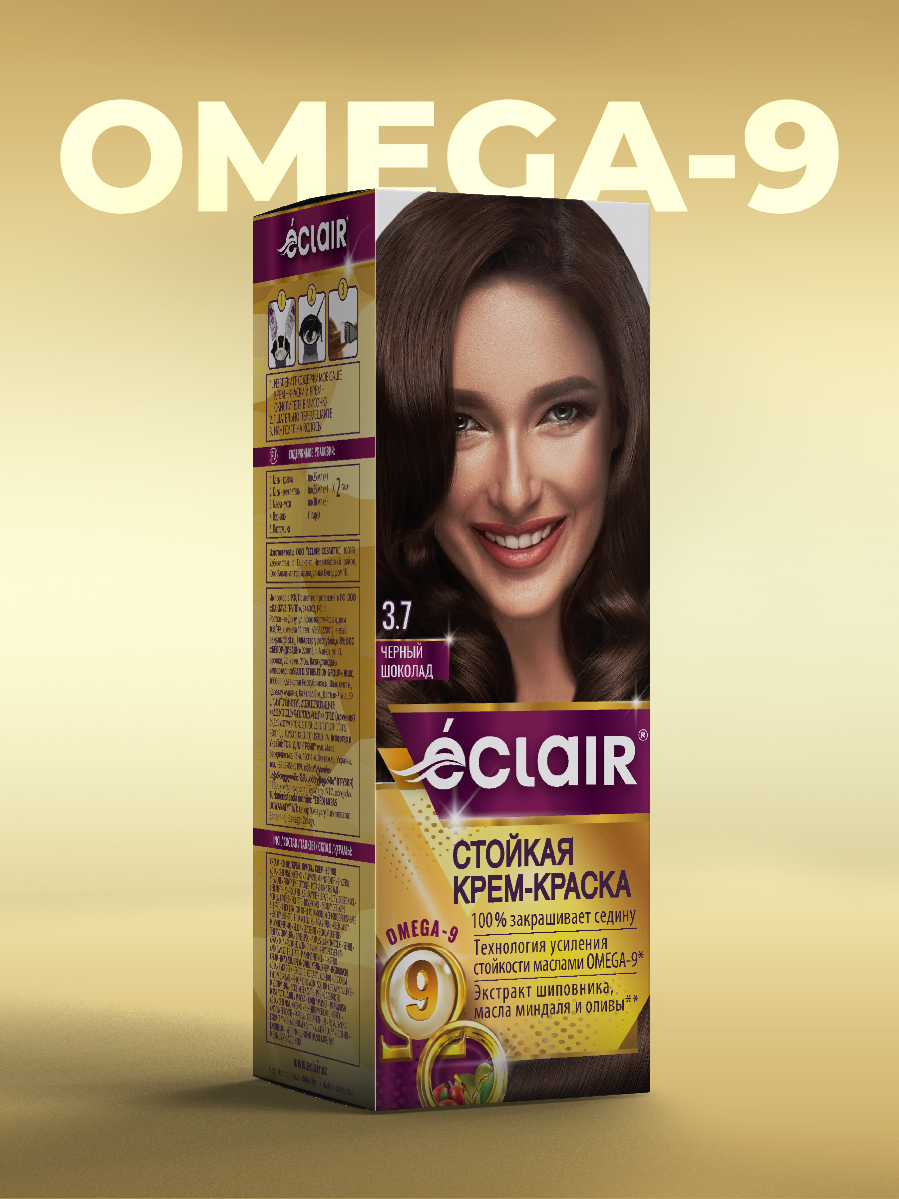 / ЕCLAIR Стойкая крем-краска тон 3,7 для волос с маслами «OMEGA 9», ЧЁРНЫЙ ШОКОЛАД