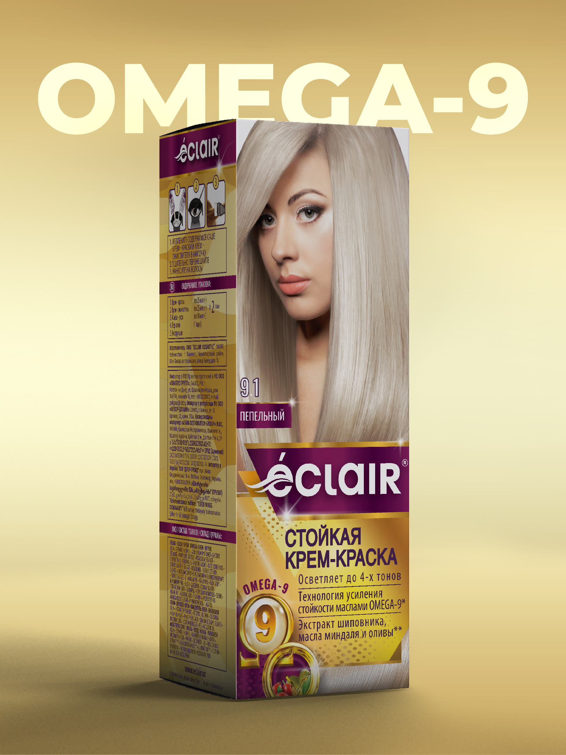 ЕCLAIR Стойкая крем-краска тон 9.1 для волос с маслами «OMEGA 9», ПЕПЕЛЬНЫЙ