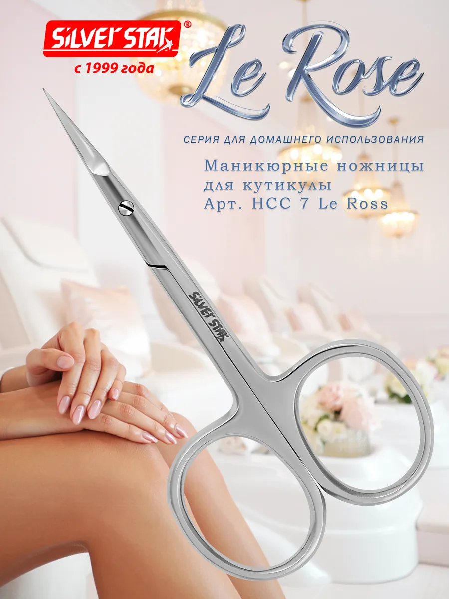 Ножницы маникюрные для кутикулы удобной формы с закругленными кончиками, профессиональные, серия Le Rose. Размер 9 см, длина лезвий 18 мм, нержавеющая сталь 42-44 HRC, серебристый блестящий цвет. Отличительная особенность: классическая форма, тонкие укороченные лезвия, глянцевое покрытие, доступная цена.